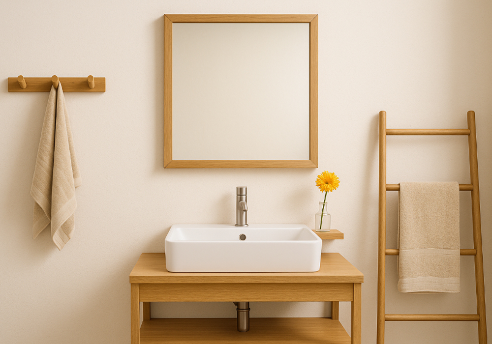 Gỗ luôn có một vibe riêng – ấm áp, gần gũi, decor kiểu nào cũng thấy sang sang kiểu Nhật – Hàn. Loại gỗ chống ẩm (gỗ tự nhiên xử lý, MDF chịu nước, hoặc gỗ nhựa PVC vân gỗ) hiện khá phổ biến.