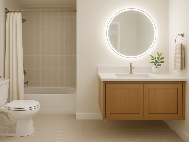 Dù hiện đại, phòng tắm vẫn cần ánh sáng dịu, ánh sáng thật nếu có cửa sổ, hoặc đèn daylight (trắng mềm) nếu phải dùng đèn.